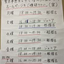 本日、緊急事態宣言が発出されました。20時以降の外出自粛に伴いまして稽古時間変更を致します。ホームページでご確認の上、御来館下さい。19時30分には稽古を終了するようにします。 月曜日 18:00~19:30 一般稽古 火曜日 16:45~18:30 ジュニア 18:30~19:30 ...